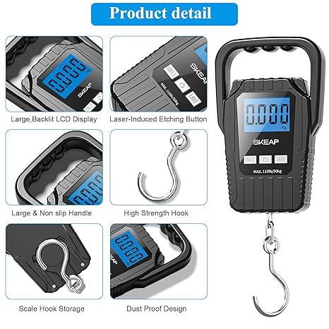 Digital Fish Scale Hanging Scale Fishing Scale, SKEAP 110lb/50kg Luggage Scale,Fish Weighing Scale, Upgrade Large Handle & Backlit LCD Display, Black,Fishing Gifts for Men,Black