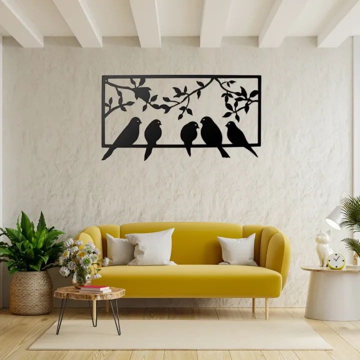 eco friendly wooden 5 black birds perch gracefully on a branch of the frame,wooden wall art decor , Hanging for Home Decoration / Size ( 1200*600 mm) by Doob Cart